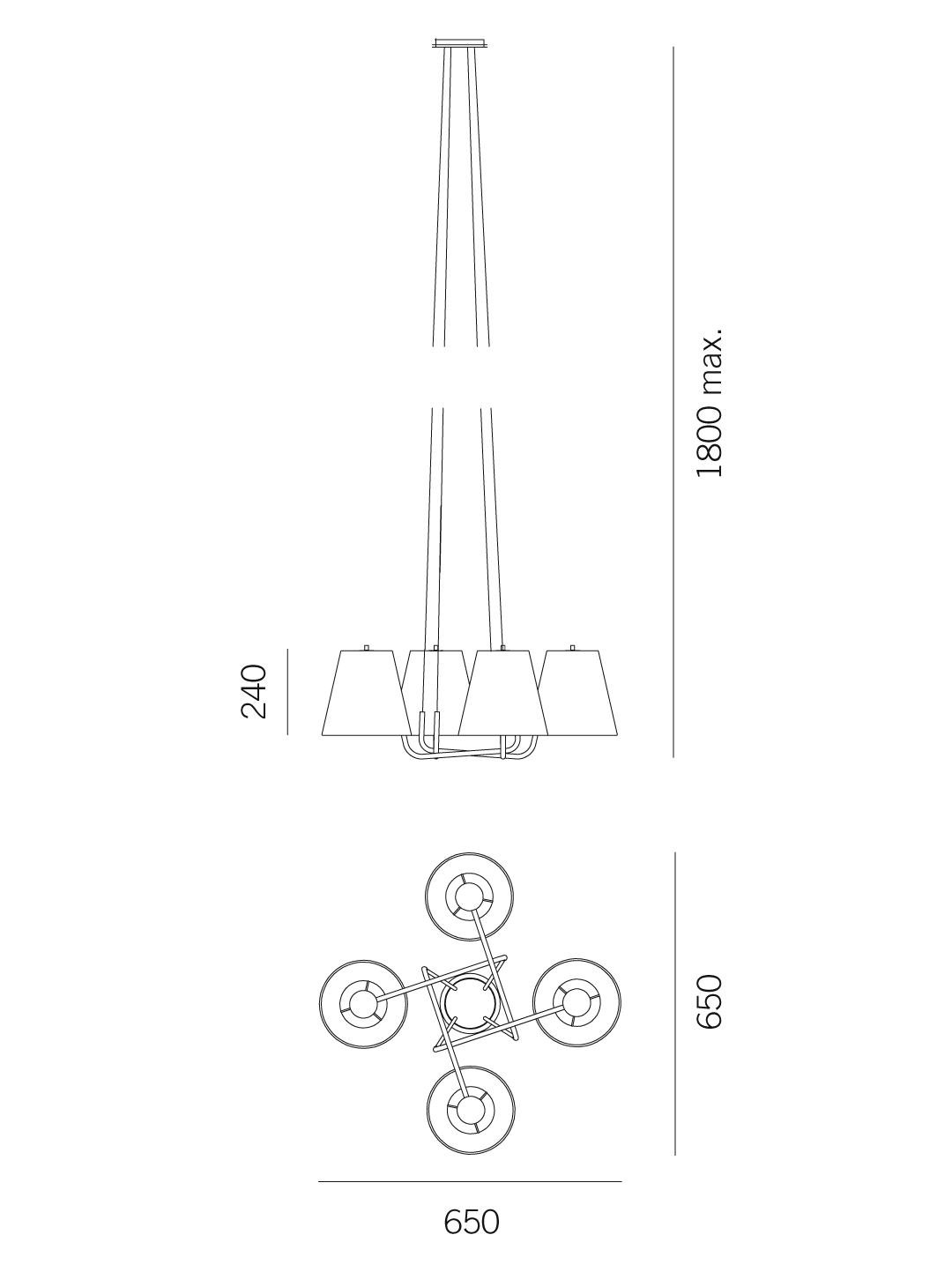 The suspended luminaire, designed by Jonathan Browning, hangs on four of Kalmar Werkstätten’s signature black textile cords from a solid milled ceiling mount and is finished in polished-nickel or polished-brass.